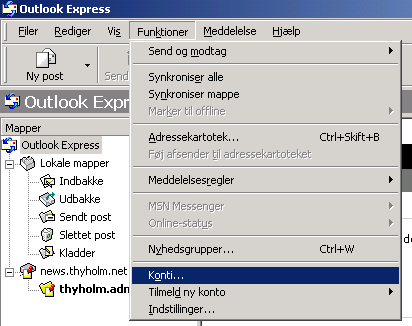 Du åbner Outlook Express og går op i menuen "Funktioner", og vælger derefter undermenuen "Konti"